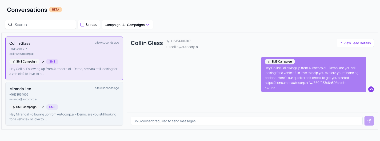 SMS Campaigns let you send bulk text messages to your dealership’s unsold traffic (up to 90 days) right from the AVA™ Portal. All replies come back into AVA™, so you can manage conversations in one place without juggling tools .