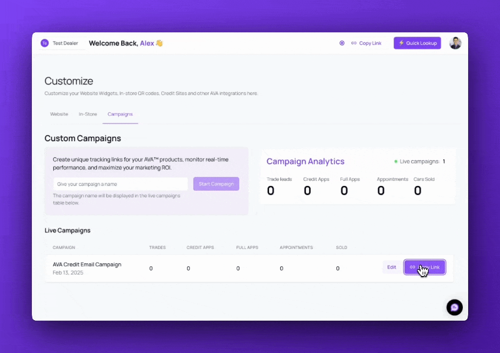 Custom Campaigns is a powerful new feature in your AVA™ Portal that allows you to create trackable links for AVA™ products, monitor campaign performance in real time, and maximize your marketing ROI. Whether you’re running email,, text, social, or landing page campaigns, you can now track exactly where your leads are coming from and which efforts are driving the best results.