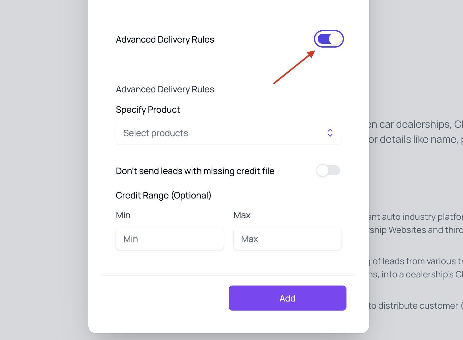 You'll see a toggle for "Advanced Delivery Rules." If your setup requires specific routing or conditions for these leads beyond the basic configuration, you can enable this.