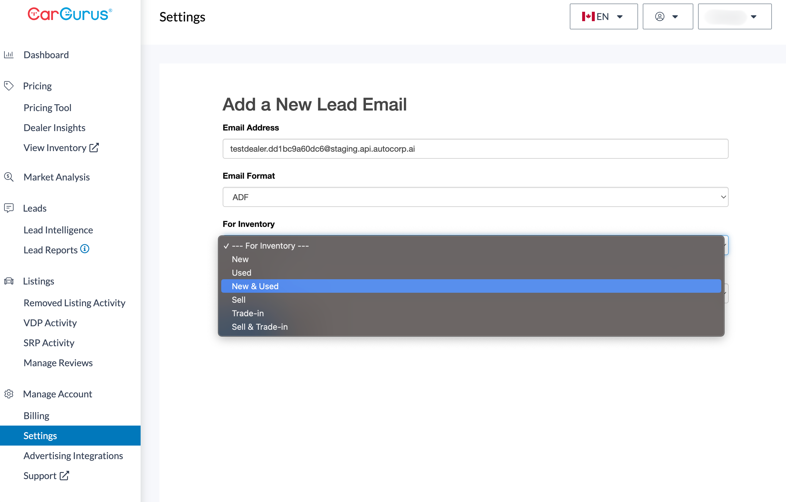 4. Click Add New Email, and fill out the form. Paste the email address from Step 2 into the Email Address field, choose ADF format and choose New & Used inventory type.
