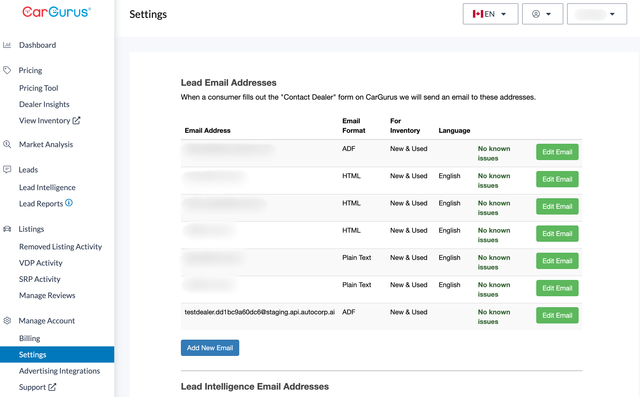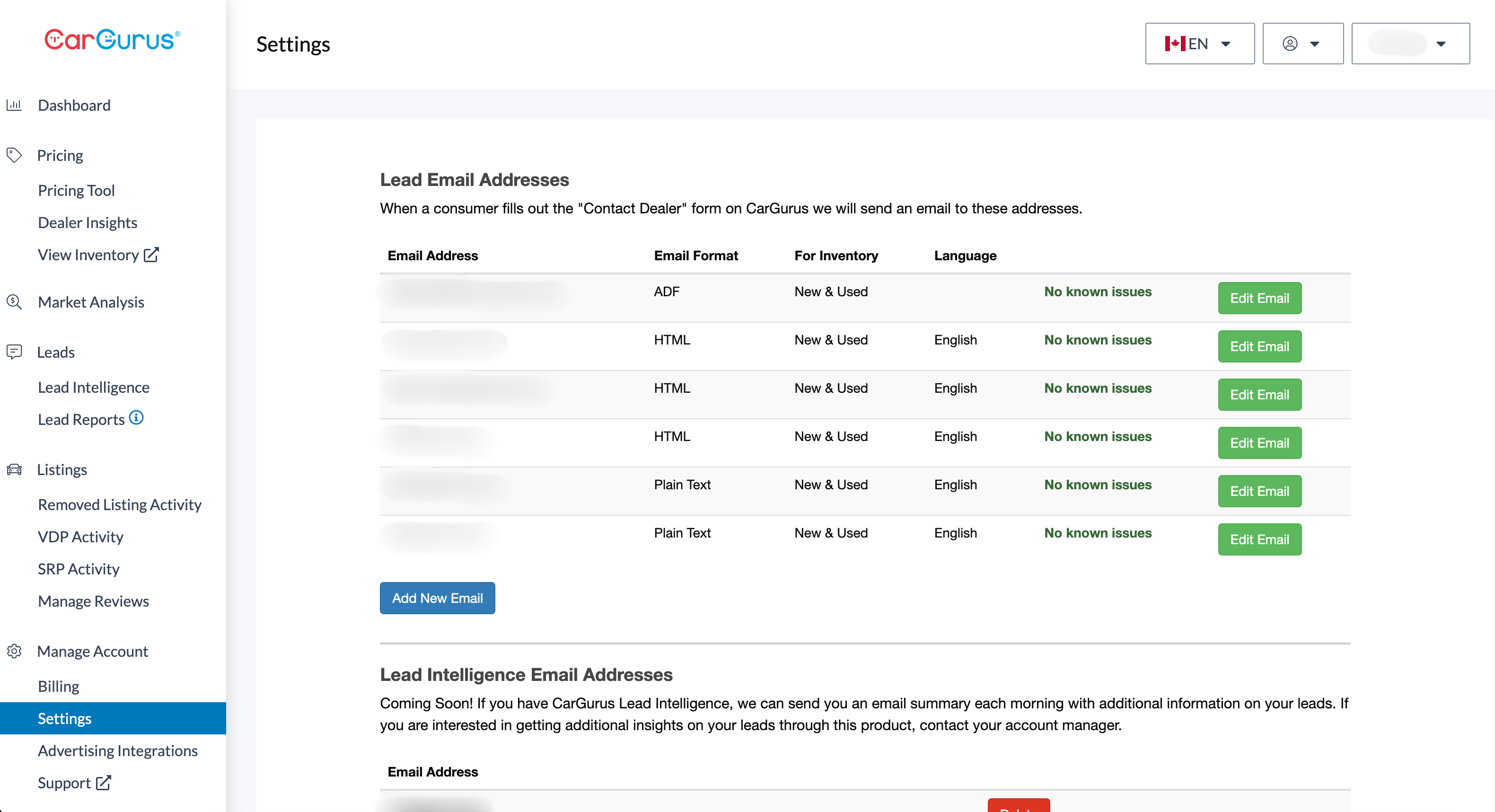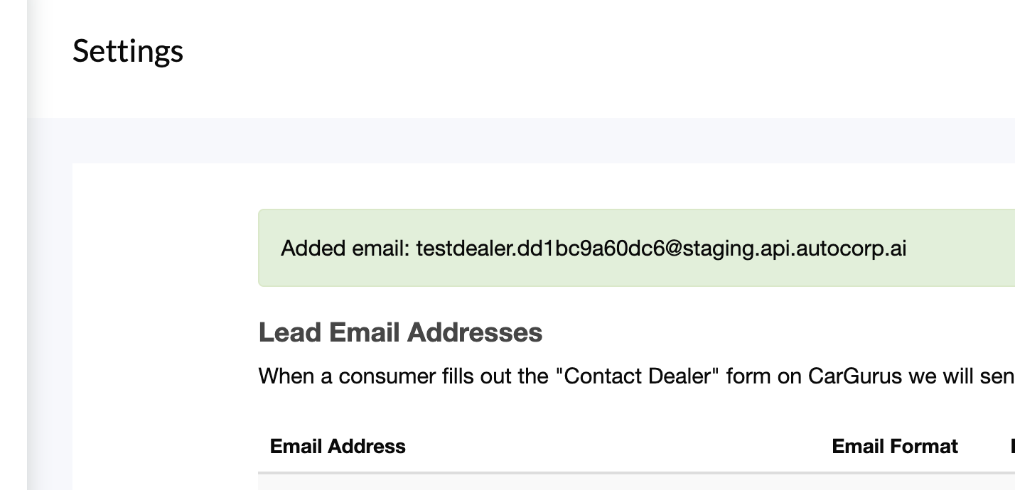 3. Login to your Cargurus dashboard, click Settings and scroll to Lead Email Addresses.