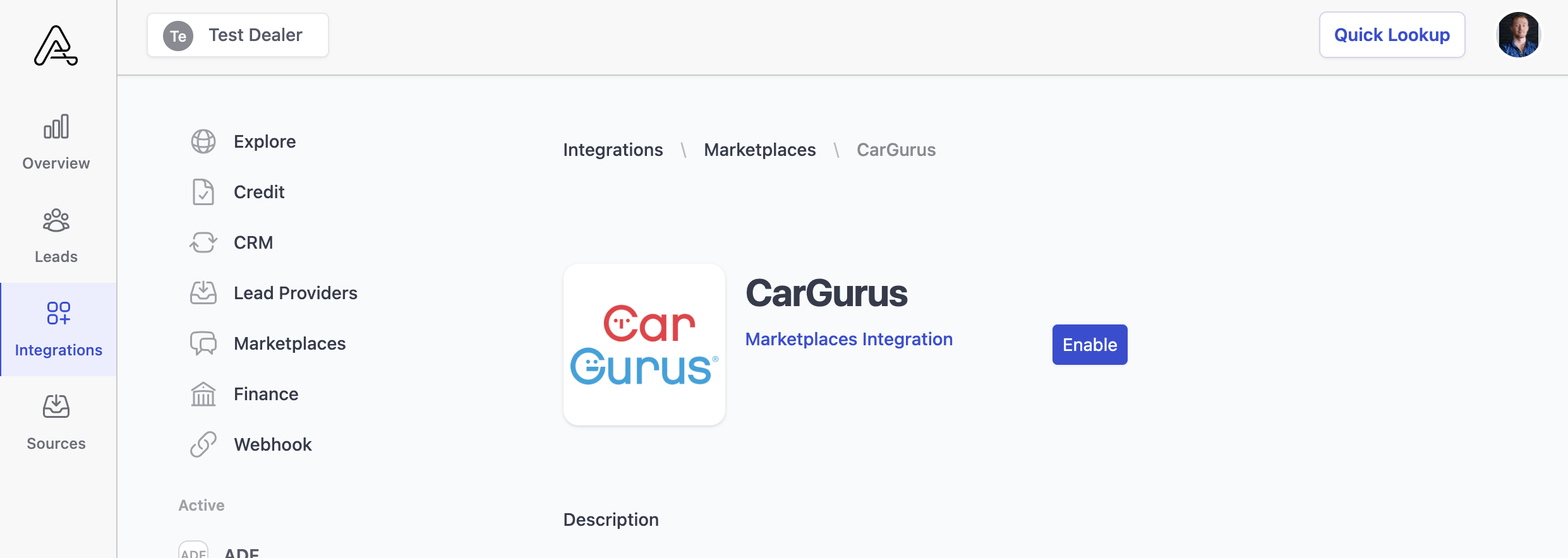 1. As a Company admin, go to Integrations and select the CarGurus integration. Then click on the Enable button