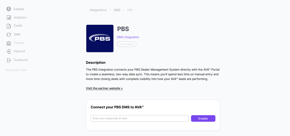 The PBS integration connects your PBS Dealer Management System (DMS) directly to the AVA™ Portal.